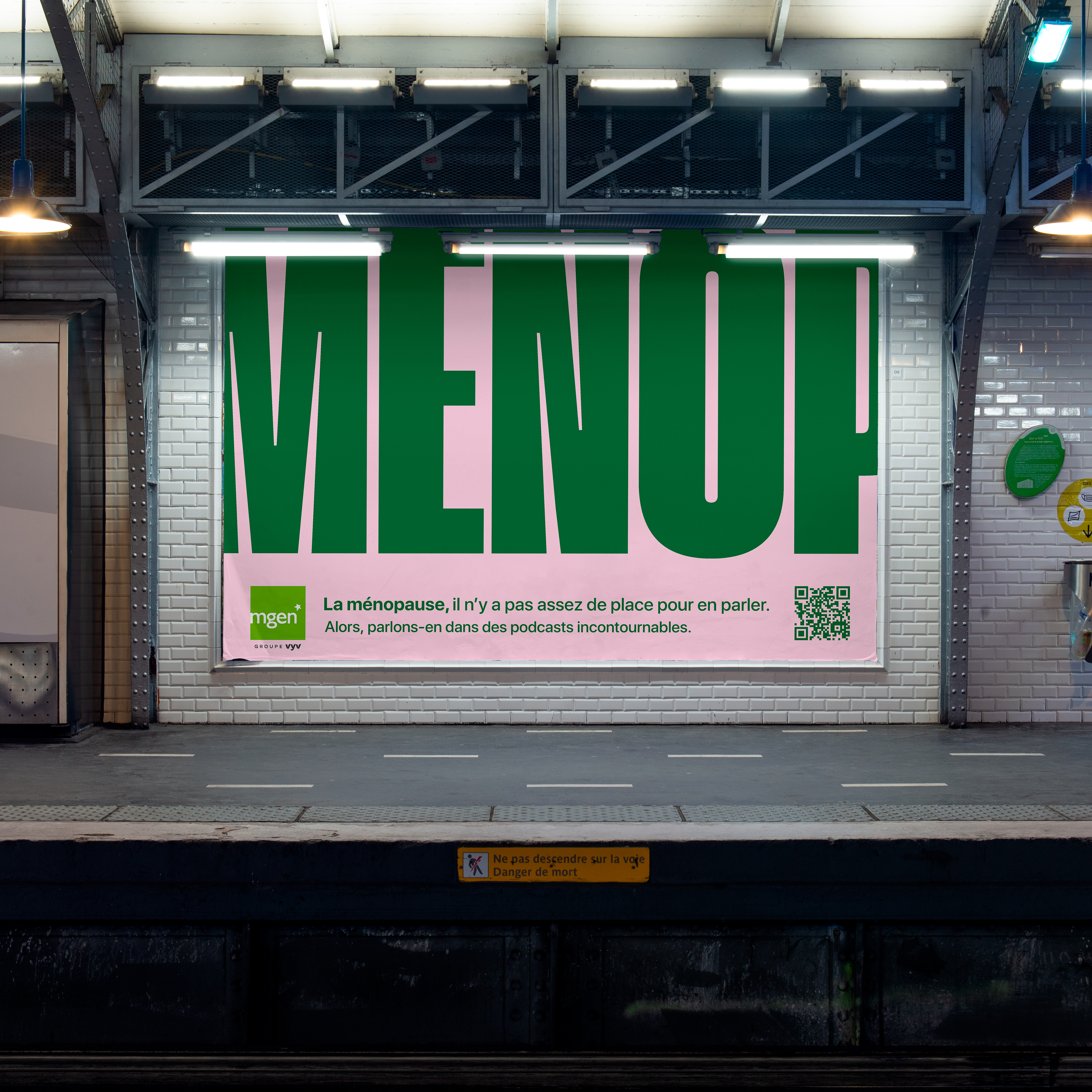 Affiche de la campagne MENOP de MGEN sur le quai du métro Bir-Hakeim à Paris, abordant le manque de discussions sur la ménopause.